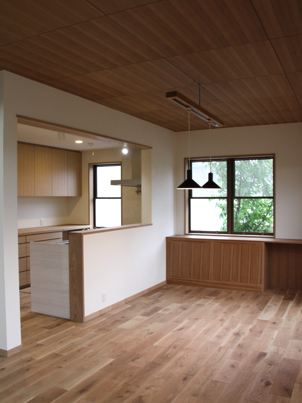 ご主人の両親が新築したのをきっかけに、幼少期から育った住まいを改装して暮らすことを決めた家族からの依頼でリフォームを行いました。無垢のナラ材の床にチーク突き板の天井のリビングダイニングに大きな木製掃き出し建具を造り付けて、庭を眺められるようにしました。既存のホール部分も取り込んだリフォーム後の玄関は自転車ラクラク入るとても広いのが魅力的。